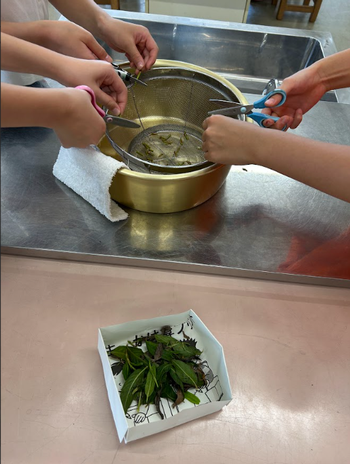 1学期は藍染め体験、2学期はお茶作り、その後は、藍染めした布で布巾づくり・・・