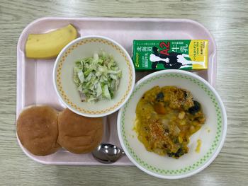 ソフトフランスパン かぼちゃのグラタン キャベツとベーコンのソテー バナナ 牛乳