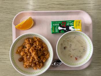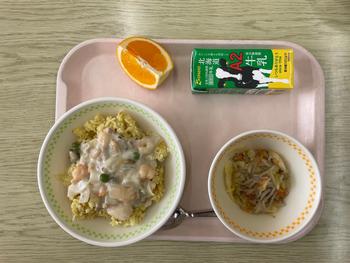 カレーピラフのクリームソースかけ 野菜炒め きよみオレンジ 牛乳