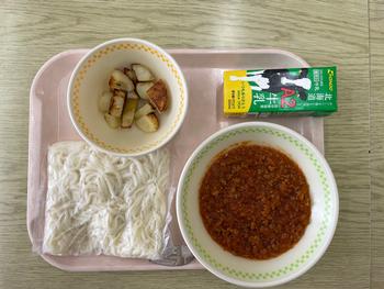 ソフト麺(カレー南蛮) おかか和え ベイクドチーズケーキ 牛乳