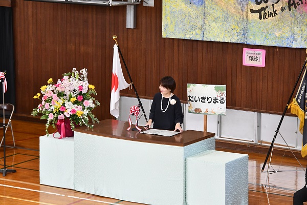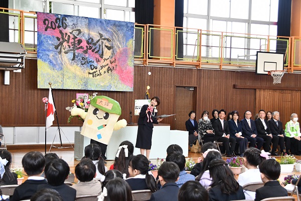 本校のゆるキャラ「大鋸まる」もお祝いに駆けつけてくれて、「楽しい学校生活を送るコツ」を教えてくれました。