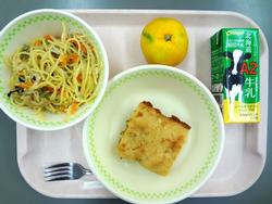 10月17日 ふじさわたっぷりペペロンチーノ りんごとさつまいものケーキ くだもの 牛乳
