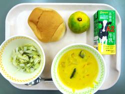 4月21日 カレーライス フルーツあえ 牛乳【1年生給食スタート】