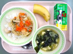 7月2日 わかめごはん あげじゃがいものそぼろに ごもくスープ 牛乳