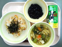 11月26日 とりにくとごぼうのおこわ アーモンドフィッシュ とうふスープ 牛乳