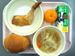 12月18日 ロールパン ローストチキン ふゆやさいのスープ くだもの 牛乳