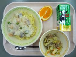 2月6日 カレーピラフのクリームソースかけ やさいいため くだもの 牛乳