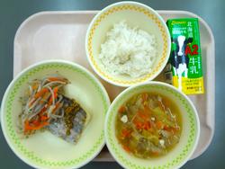 4月16日 ごはん さわらのてりやき ゆでやさい かきたまじる 牛乳