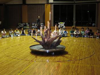 キャンプファイヤー 各クラスのスタンツが終わるのを待っていたかのように、雨が降り出しました。おしまいかなと思っていたら… なんと集会棟で キャンドルファイヤーに変更! 二つとも体験できるのは、滅多にないことです。よい思い出になりましたね。
