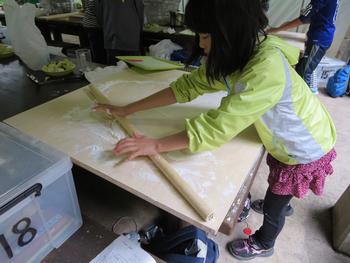 指導補助員さんに柔らかさを何回かチェックしていただきながら、こうやってのし棒でのばしていきました。 |