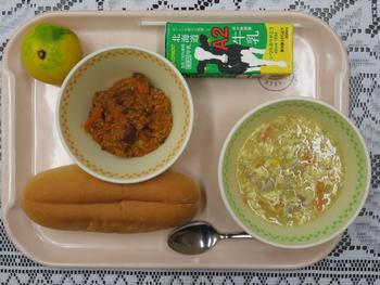 (セルフ)、かきたま汁、みかん、牛乳です。