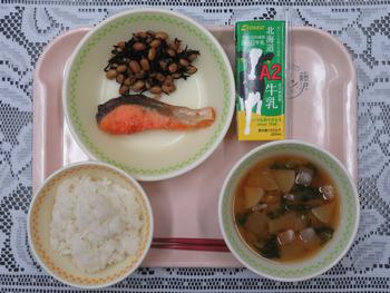 さけの塩焼き、だいずの磯煮、みそ汁、牛乳です。