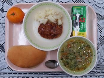 フ)、粉ふきいも、ジュリアンスープ、みかん、牛乳です。