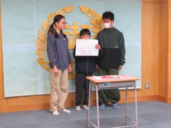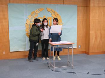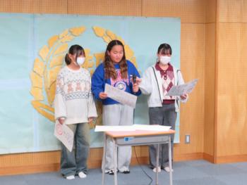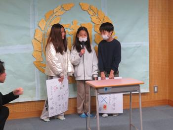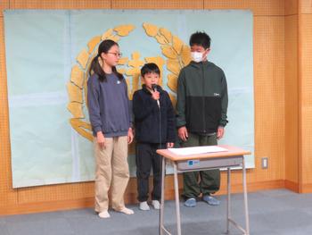 12.24(水)8:40からテレビ放送で、2学期終業式が行われました。各学年代表による「2学期の振り返り」と、運営委員会による「冬休みの過ごし方」がありました。それぞれの学年が様々なことに取り組んで成長したことがうかがえました。「冬休みの過ごし方」を忘れず、安全で楽しい冬休みを過ごしましょう。
