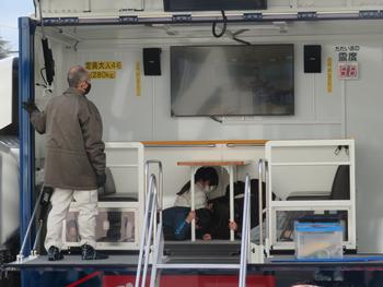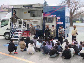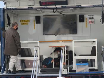 1.19(月)3校時に、西昇降口前で藤沢市の起震車による「地震体験」を行いました。4~5人ずつ起震車に乗り、震度6強ぐらいのかなり強い地震のゆれを体験しました。子どもたちはとても立っていられないぐらいでした。安全のため机・椅子は固定されていて、タンスや食器などもない状態でしたが、実際には周りの物が激しく動き、危険な物に変わってしまいます。今回の経験を生かし、身を守る行動がすぐにできるように心がけましょう。