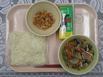 大豆のアーモンドあえ、牛乳です。