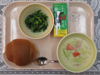 クリームシチュー、あおなとじゃこのソテー、牛乳です。