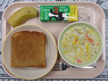 セサミトースト、クリームスープスパゲッティ、バナナ、