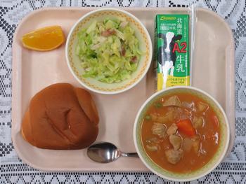 です。米粉ロールパン、ポークシチュー、キャベツとベ