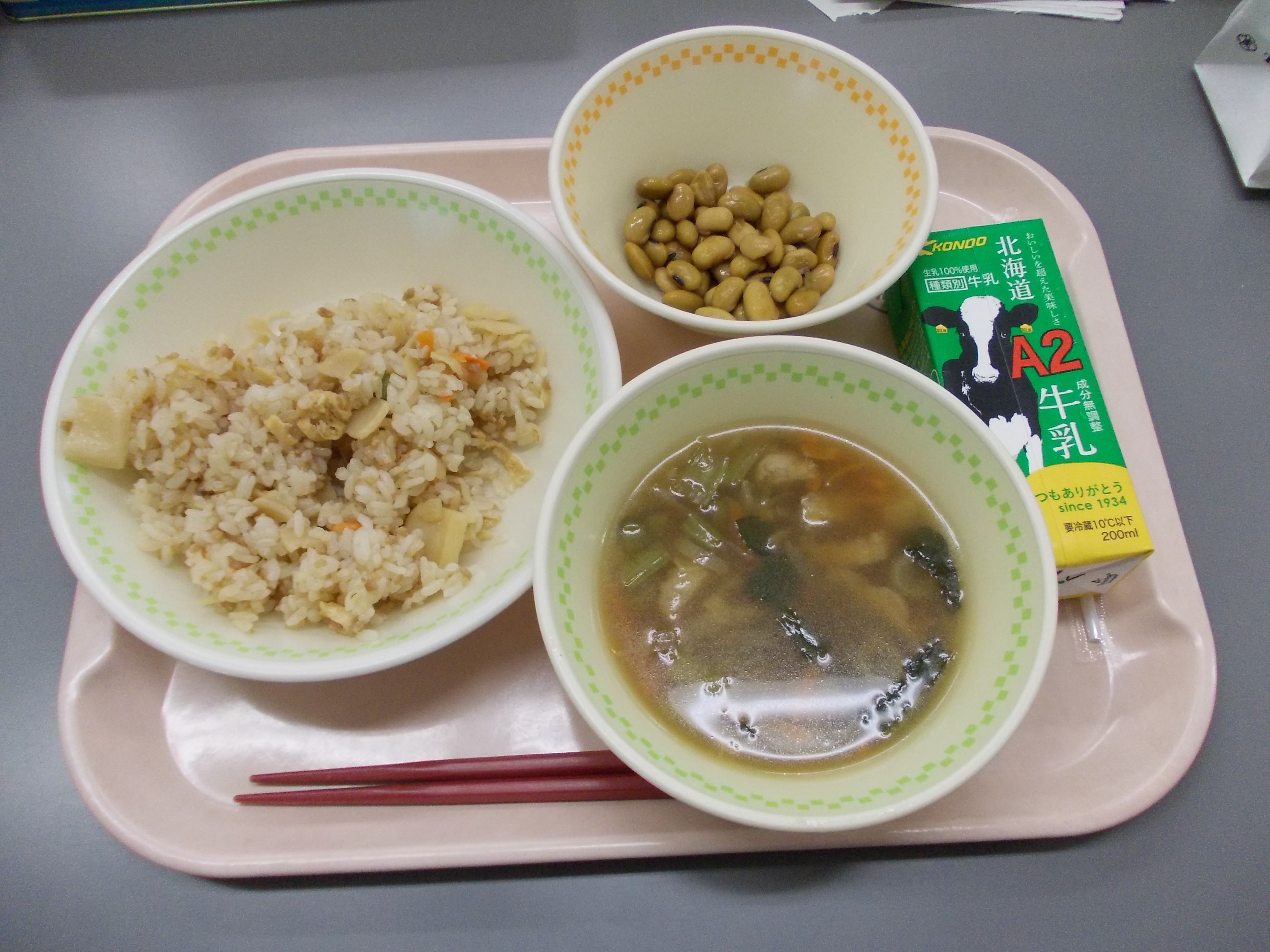 4月14日(火)は、たけのこご飯、しゅうゆまめ、せんべい汁、牛乳です。