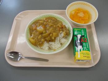 今日の給食は、カレーライス、フルーツあえ、牛乳でした。