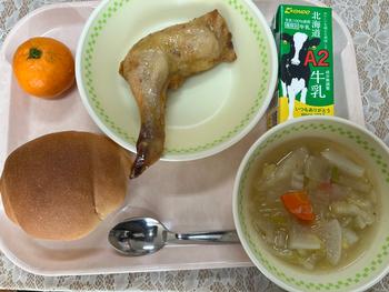 給食の骨付き鶏もも肉は、小さめで子どもにも食べやすく、夏に受注し特別につくってもらっていると聞いています。