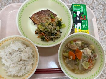 さっぱりとしたお魚に、もやし・にんじん・小松菜など野菜たっぷりのごま和え。
