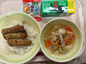 豚汁はいつもと変わらず具沢山。野菜や豆類がたっぷりとれます。