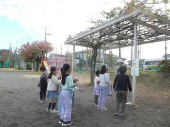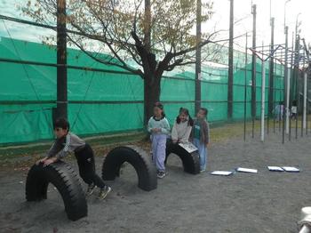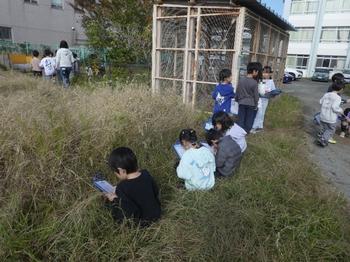 1・2年生の子どもたちが。1・2探検で学校の校舎の外へ。敷地内は広くて、グラウンドや畑も、秋が深まりちょっと様子が変わってきています。
