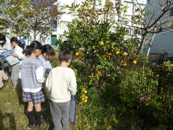ミカンの木を見つけた子が、「(給食の)冷凍ミカンって、これでつくっているのかな?」と言うと、他の子が、「あれはミカンを冷凍しているだけなんだよ」と答えます。