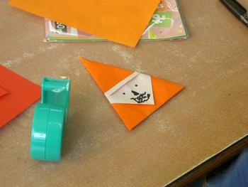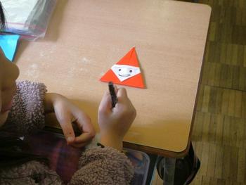 1年生の教室では折り紙を使ったサンタさん作りが行われていました。
