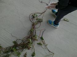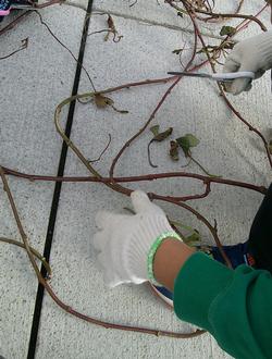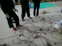 サツマイモの蔓も長いものは、協力して葉をとり、蔓でリースを作ります。