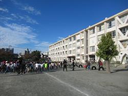 朝会が終わって、校舎に戻るところです。