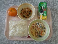 かきたまうどん (ソフトめん) きりぼしだいこんの ごまあえ れいとうみかん ぎゅうにゅう |