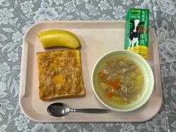 ツナとごぼうの トースト まめとやさいの スープ バナナ ぎゅうにゅう |