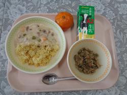 カレーピラフの クリームソースかけ いんげんとじゃこの アーモンドあえ れいとうみかん ぎゅうにゅう |
