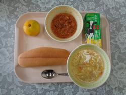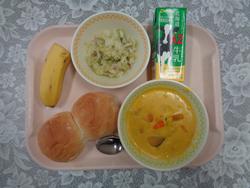 ソフトフランスパン パンプキンシチュー キャベツと ベーコンのソテー バナナ ぎゅうにゅう |