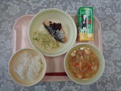 ごはん (藤沢産新米) さばのヤンニョム カンジャンかけ ゆでやさい ちゅうか とうふスープ ぎゅうにゅう |