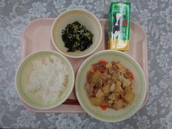 《ふじさわランチ》 ごはん (藤沢産新米) ぶたにくとやさいの にもの わかめとしらすの にびたし(新) ぎゅうにゅう |