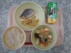 ごはん さわらのてりやき ゆでやさい ぶたじる ぎゅうにゅう |