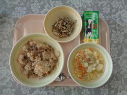 とりにくとごぼうの おこわ アーモンドフィッシュ とうふスープ ぎゅうにゅう |