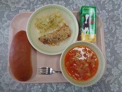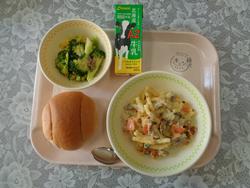 【給食週間イタリヤ】 くろパン (新)しろいとだらの こうそうパンこやき ゆでやさい ミネストローネ ぎゅうにゅう