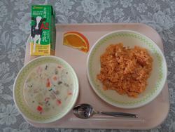 【給食週間アメリカ】 ジャンバラヤ あさりのチャウダー ネーブルオレンジ ぎゅうにゅう |