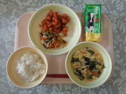【給食週間 韓国】 【マシッソヨ コリアンスペシャル】 ごはん (新)ヤンニョムチキン もやしのナムル (新)わかめと たまごのスープ ぎゅうにゅう |