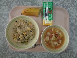 【あったかみんなが好きな給食】 こまつなチャーハン とうふスープ バナナ ぎゅうにゅう |
