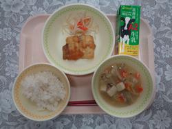 ごはん たちうおの わふうソースかけ ゆでやさい りきゅうじる ぎゅうにゅう |