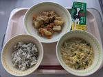 今日の給食:じゃこごはん、生揚げと野菜のそぼろ煮、かんぴょうの卵とじ汁、牛乳
