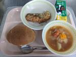 今日の給食:ふじさわロールパン、鮭のパン粉焼き、ミネストローネ、牛乳