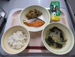 今日の給食:ごはん、鮭の塩焼き、野菜のごまあえ、味噌汁、牛乳