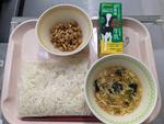今日の給食:ソフト麺、かきたまうどん、大豆のアーモンドあえ、牛乳